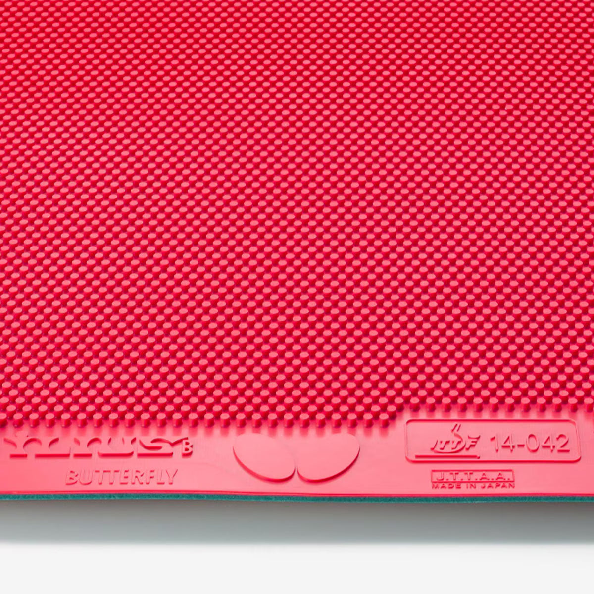 Butterfly Ilius B is a completely new long pip top sheet with a brand new sponge, Absorber Sponge Drop. When long pips rubber has hard sponge, the pimples will bend more, thus greater effects will be obtained. Generally, the harder the sponge, the more difficult it is to control as the speed of the ball off the racket gets faster. However, Absorber Sponge Drop absorbs the energy of the opponent's ball well even during hard impact, so you can have high stability while taking advantage of the long pimpled effect. The top sheet is also rather hard with pimples whose aspect ratio is at the highest limit permitted to extract the features of the rubber. The combination of the top sheet and Absorber Sponge Drop provides a high performance when playing a short stroke over the table, such as chop block. In addition, innovative attacking and defensive play are both possible, thus making best use of the characteristics of the long pimples, such as a low penetrating backhand with minimal spin. In addition, the durability of the top sheet has more than doubled compared to the Feint Long III, which has a similar pimple shape. This is due to the compounds used to achieve durability whilst maintaining the performance of the rubber.