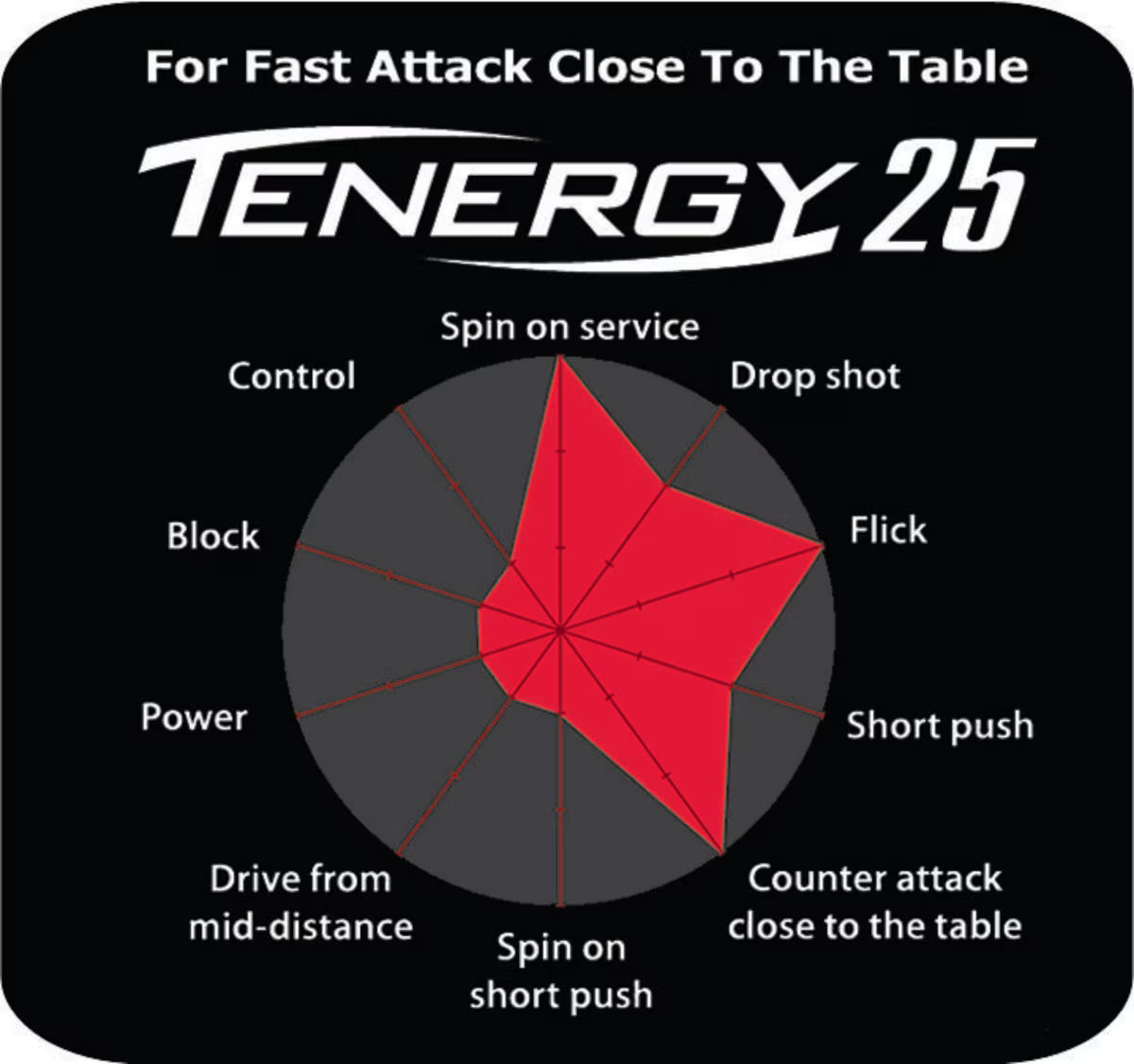 Tenergy 25 uses pimples that enable fast counter attacking play; they have been appraised to be best for attack and controlled play close to the table. Tenergy 25 is perfect for play both close to the table and at mid distance; experience the advantage of aggressive play close to the table and rapid counter attacks.
